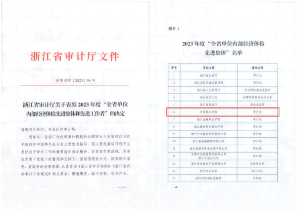 近日,浙江省审计厅发布了《浙江省审计厅关于表彰2023年度“全省单位内部经济体检先进集体和先进工作者”的决定》(浙审内审[2023]96号),我校审计处荣获2023年度“全省内部经济体检先进集体”称号。