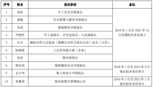 依据《中国美术学院内部审计工作规定(修订)》和《中国美术学院中层领导干部经济责任审计实施办法》等有关规定,根据学校党委组织部委托以及2022年审计工作联席会议决定,审计处自2022年5月起对以下10名中层领导干部开展任期(离任)经济责任审计,对以下3个部门(单位)开展相关审计。现将有关事项公告如下: